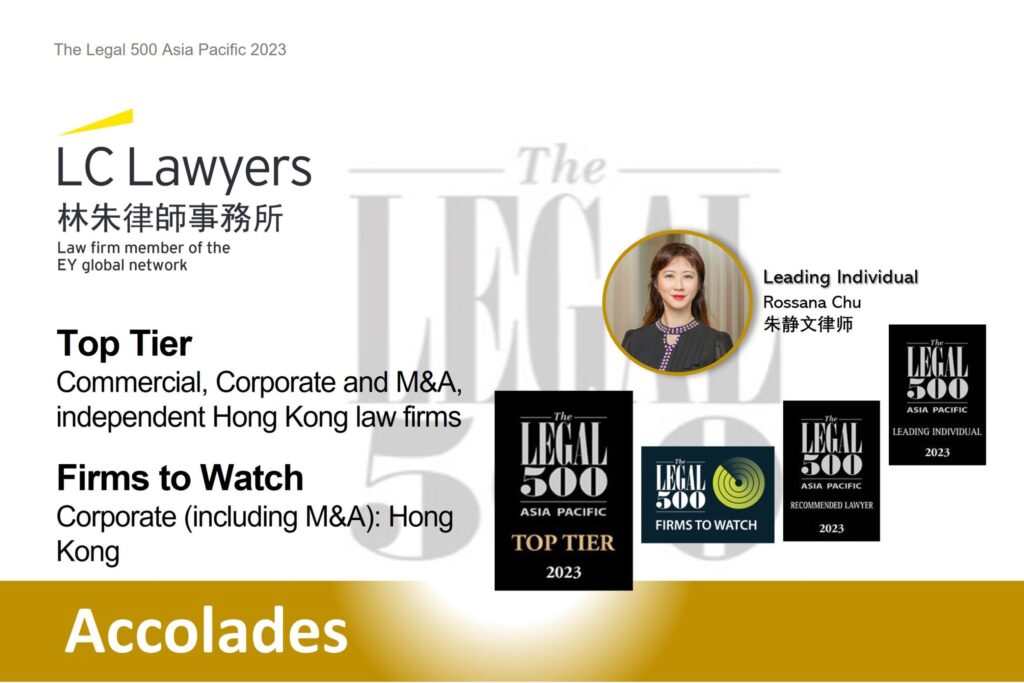 We are pleased to announce that LC Lawyers LLP has been recommended by The Legal 500 as “Top Tier” firm and our Managing Partner Rossana Chu is listed in the elite “Leading lawyers” (Leading Individual) group for the first time.